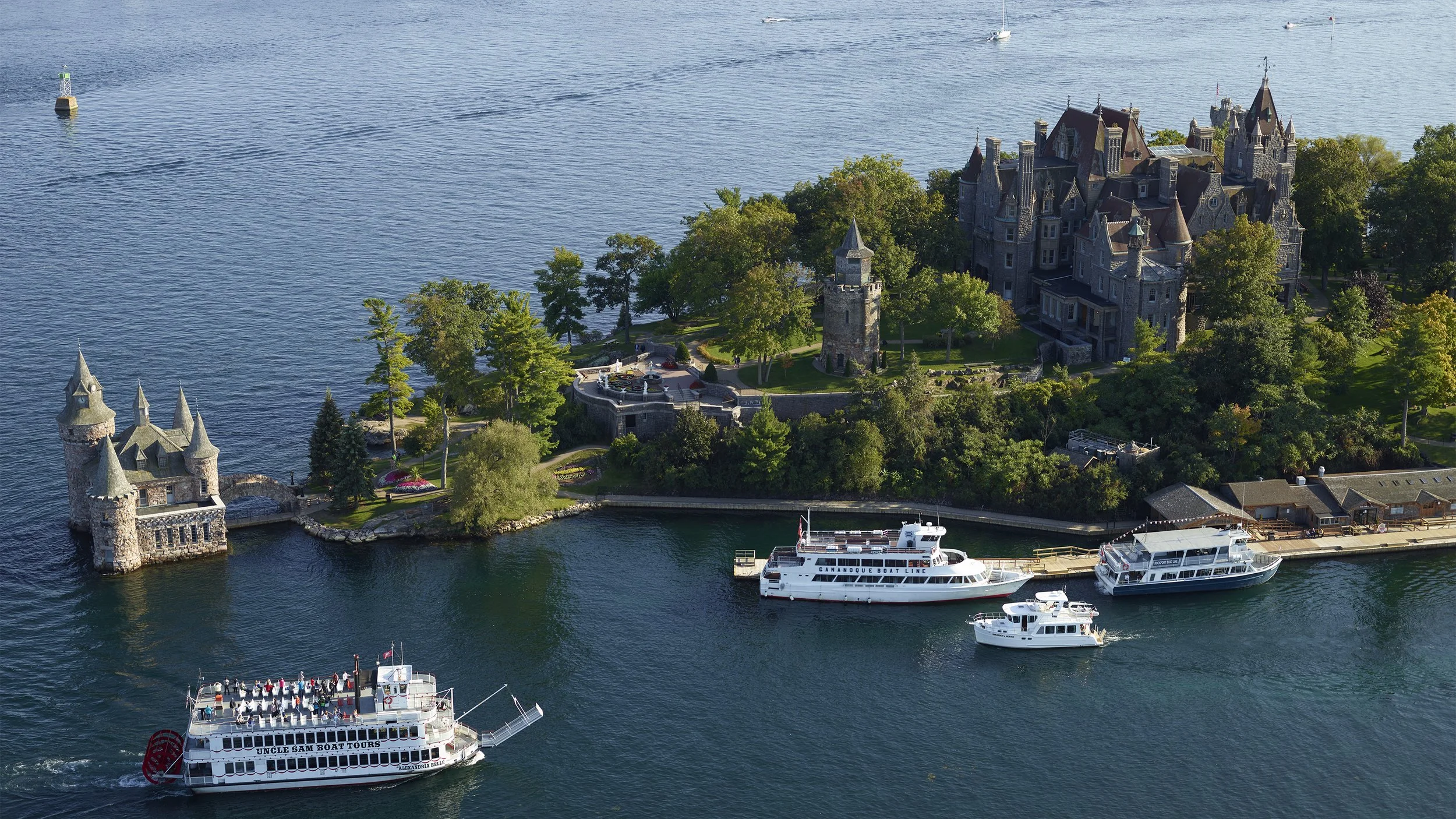 Your experience begins at the Uncle Sam Boat Tour Docks in Alexandria Bay, where guests will board boats for the short and scenic ride to Comfort Island.